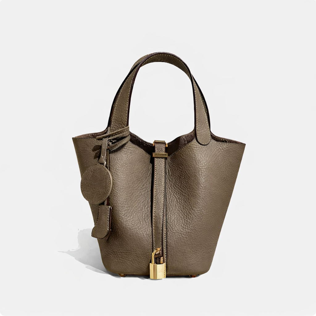 This design features a secure structured strap closure with elegant lock detail for both style and peace of mind.